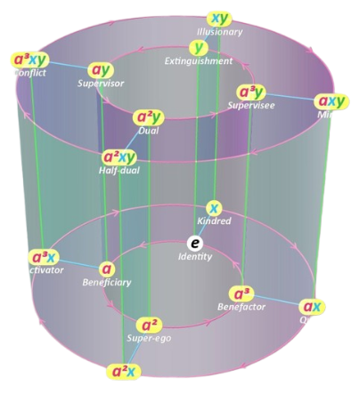: This already has been defined. Its group structure is (elementary abelian group of order 16), isomorphic to . Rigorously, an object is a dichotomy system (, , ) where is a dichotomy system, is any valid type of the Socion, and is an -action (or representation).
